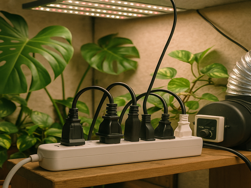 Place surge protectors away from water sources and ensure cords are not pinched or exposed to heat. Avoid daisy-chaining surge protectors — use one well-rated protector per setup. For higher power demands, especially in larger grows, consult an electrician to correctly manage your power distribution and protection.
