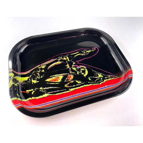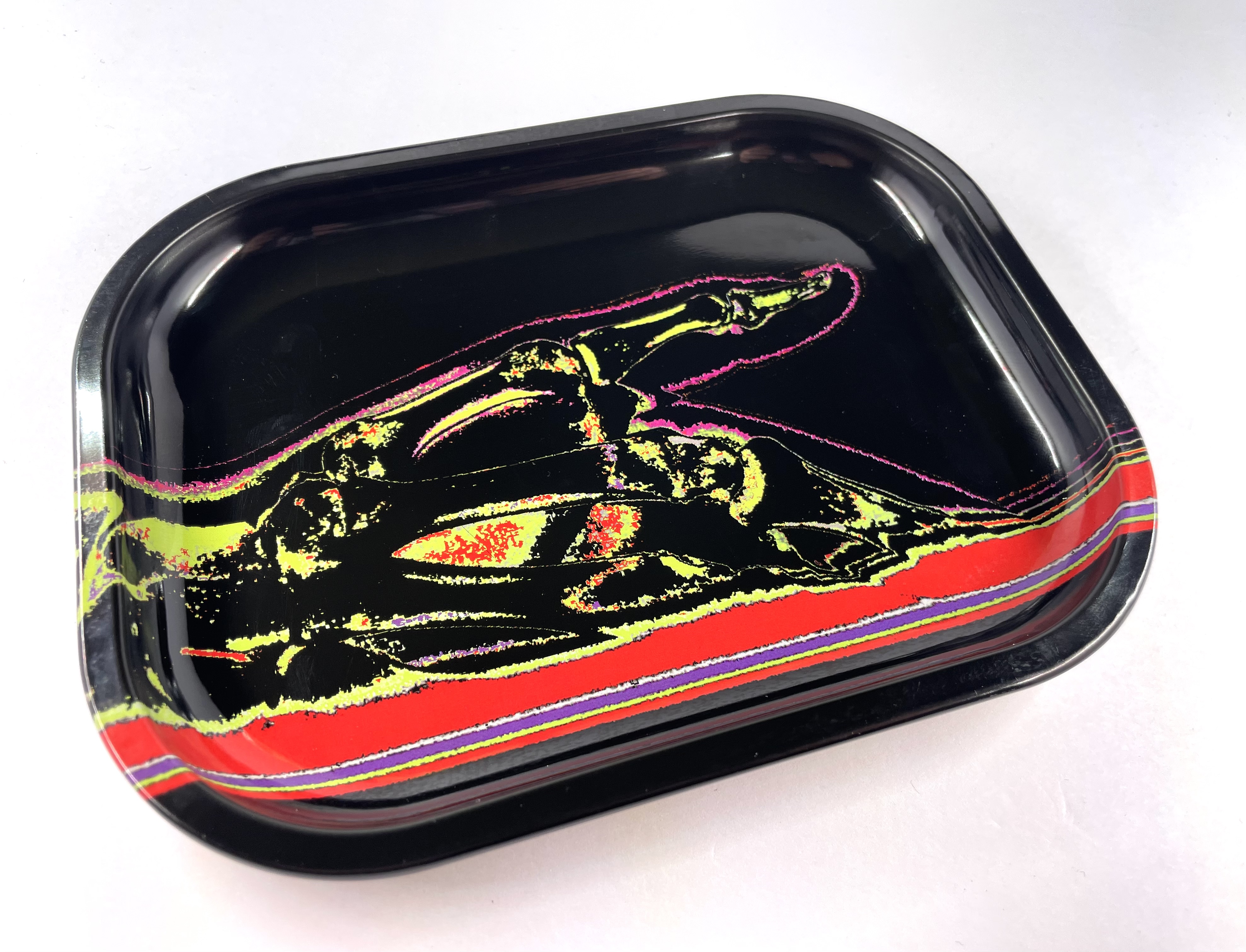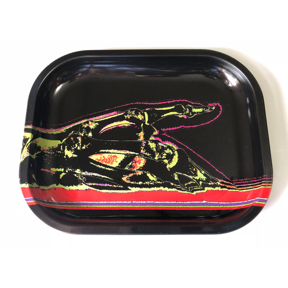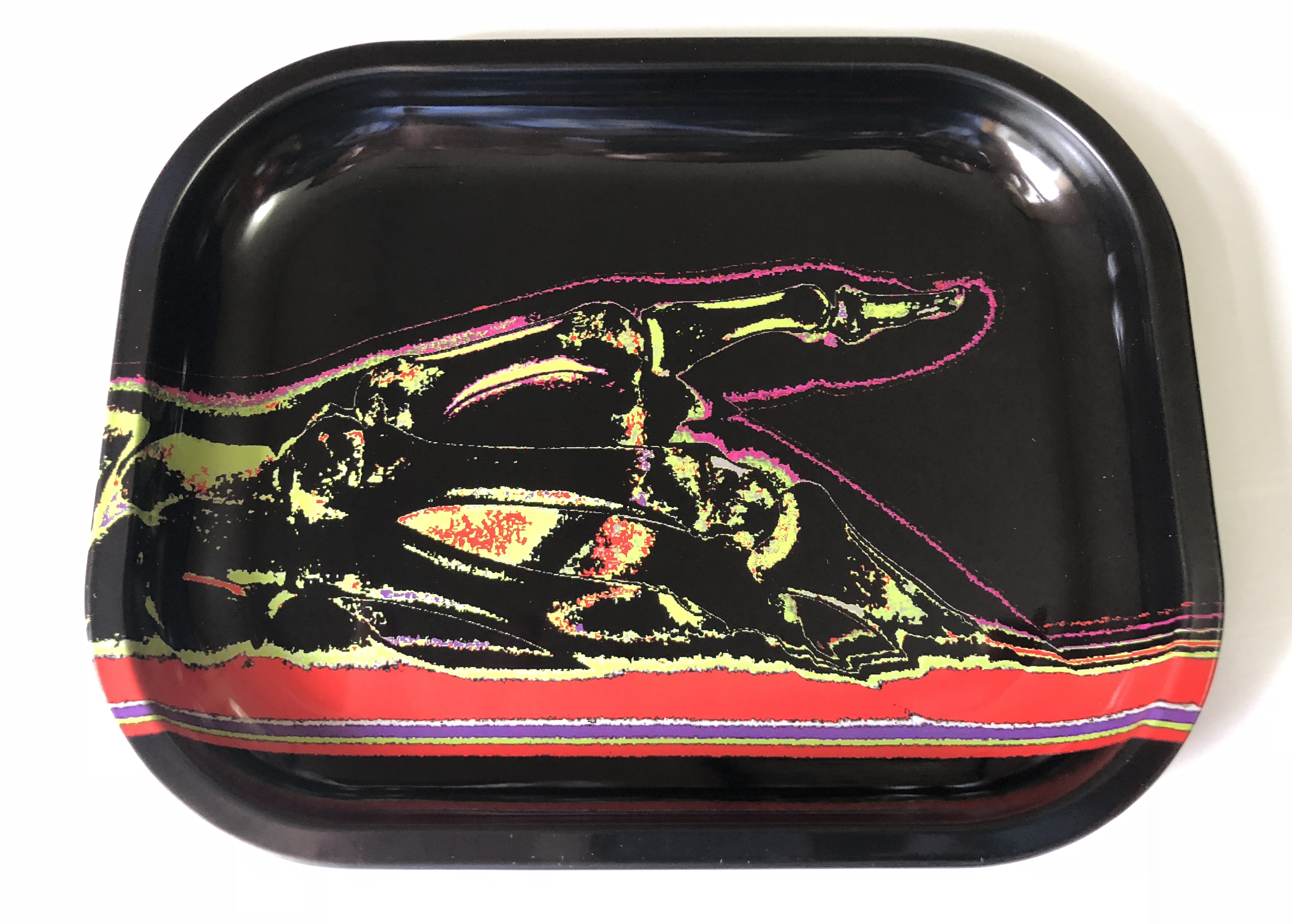 Metal rolling tray with picture of hand x-ray with neon colors on front. Durable small tray perfect for rolling a joint on the go. Best gift for holidays, birthdays or Halloween.