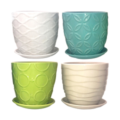 Ideal for houseplants, indoor stoneware ceramic pots with drainage holes and saucers. Includes pallet displayer.  Each pallet contains 18 of each pottery design color: white, aqua blue, soft pink, and forest green. Pottery size : 6" x 5.5"