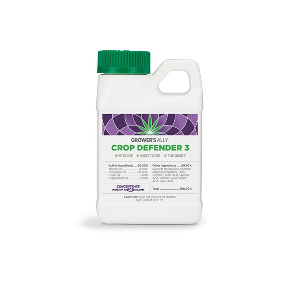 Grower's Ally Crop Defender 38oz - ConcentrateGrowers Ally Crop Defender 3 is an OMRI Listed miticide, insecticide and fungicide for weekly use to prevent common pests. Formulated with a synergistic blend of botanical oils and a surfactant, it is a highly effective crop protection formula that can be safely applied up until the day of harvest and leaves zero pollutants. The triple-action formula kills powdery mildew, spider mites, russet mites, thrips, aphids and other soft-bodied insects as well as their eggs on contact. Trusted by large scale growers for use in the flowering stage and suitable for all grow environments and cultivation facilities: indoor, outdoor, greenhouse, hydroponic.