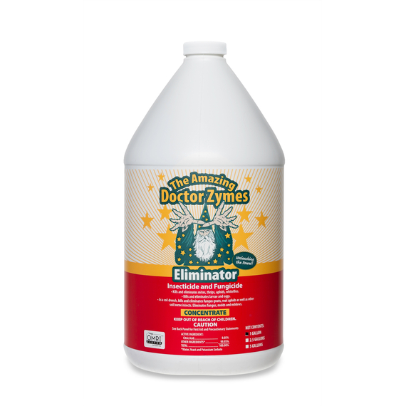 The Amazing Doctor Zymes’ Eliminator is an OMRI listed, revolutionary green solution that kills and eliminates soft-bodied insects, molds and mildews on your indoor and outdoor gardens. The active ingredient, citric acid, is derived from a fermentation process and is combined with other biologically stimulating ingredients to form a highly effective insecticide and fungicide. Eliminator is a mechanical action that pests, molds, and mildews cannot become immune to. It works by disrupting the insects’ ability to breathe, and breaks down protein and organic matter. It is also oil-free and therefore does not clog the stomata, resulting in increased photosynthesis, respiration, and transpiration. It increases yields when used as a preventative by keeping pests, molds, and mildews off your plants, fruits, and vegetables. Eliminator’s proprietary formula is made in handcrafted batches to ensure maximum quality control. Many customers have told us that if they had to select only one product on the market to meet their needs, it would be Eliminator.