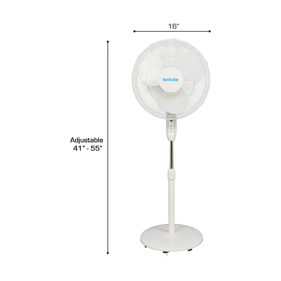 Built on a legacy of quality, performance and reliability, the Hurricane® Supreme 16 inch Oscillating Stand Fan with Remote is ideal for homes, greenhouses, and shops. This quiet 3-speed fan—with options for high, medium and low—is ideal for generating a cooling breeze with minimal disruption. The 90° oscillation and adjustable height from 41 inches to 55 inches —and to target one area, the fan can be locked in a non-oscillating position. Power the 3-speed fan motor and oscillation settings with the battery-powered remote control. As an industry leader in fans, these wall mount Hurricane Fans feature chemical resistant polypropylene blades, a powder-coated steel grill and a steel support neck to ensure high performance with durability. Great output with 1350 RPMs and airflow of 1201 CFM on high. The fan is easy to assemble. The sturdy base is designed to keep fan upright. Comes with a 5-foot power cord. ETL listed.