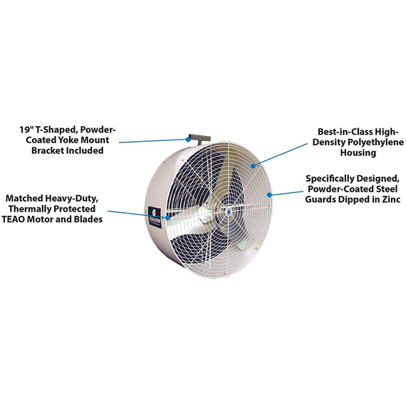 The Schaefer versa-Kool 36" circulation fan with solid housing and yoke mount—11,400 cfm is the ideal cooling solution for dairies and livestock. Engineered to produce greater air movement and superior cooling, it’s the right choice no matter the application. The best-in-class, high density polyethylene housing provides a greater temperature range for use and superior corrosion, moisture, stress crack, wear, and abrasion resistance. The matched heavy-duty, thermally protected teao motor and blades provide maximum velocity, and the specifically designed, power-coated steel guards dipped in zinc give this legendary fan its trusted durability, long life, and corrosion resistance. Plus, the supplied powder-coated yoke mount bracket makes for easy installation.
