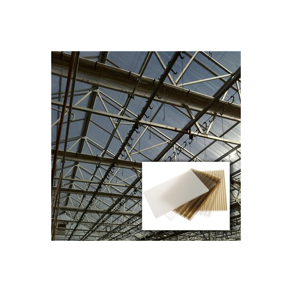 Green-tek ThermaGlas Twinwall Polycarbonate Sheet8mm - 71.25in x 9ft - ClearDesigned and engineered specifically for commercial greenhouse applications, Green-Tek's ThermaGlas Multi-wall Polycarbonate Sheet offers superior functionality and durability. Available in clear or a range of specially formulated colors and tints, it provides options to suit various needs. With 99.5% UV protection, it ensures optimal conditions for plant growth. The multiwall design and lightweight construction contribute to cost savings by reducing the need for extensive supporting structures. Its shatterproof polycarbonate composition, combined with an integrated UV-resistant co-extruded layer, guarantees longevity, supported by a 10-year limited warranty. The cellular multi-layer structure facilitates energy efficiency, reducing heating costs in winter and minimizing heat build-up in summer. Additionally, a specialized coating on the underside prevents condensation dripping, maintaining a stable environment. Ideal for greenhouses, garden centers, and other agricultural covering applications, its features include superb thermal insulation, impact resistance, weather and UV resistance, low flammability, ease of installation, and versatility in shaping. With a wide service temperature range and a 10-year limited warranty, it offers reliability and peace of mind for long-term use.R-Factor: 1.72U-Factor: 0.58Rib Spacing: 10mmLight Transmission: 80%Haze: 22%