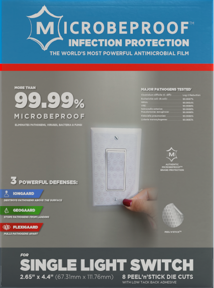 The film provides long-lasting protection for over 12 months, is made from durable, flexible vinyl that conforms to standard and specialty switch plates, and features a phosphorescent MicrobeProof “M” pattern for easy identification and brand authenticity. For transparent or specialty applications, MicrobeProof PET Crystal Clear film offers high clarity while maintaining antimicrobial performance.