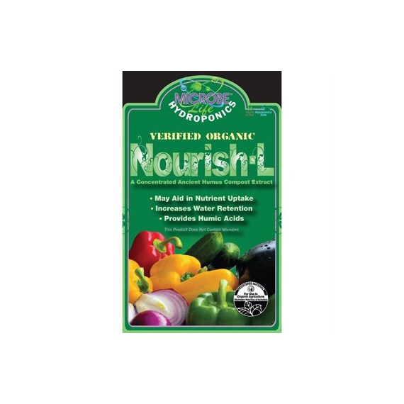 MICROBE Life Hydroponics Nourish-L Liquid Fertilizer5galContains Rare Earth Humates and is certified organic. A unique, liquid conditioner derived from a highly decomposed organic humus deposit. Enhances the ability of plants to absorb nutrients more efficiently, optimizing plant functions and facilitates greater results using less nutrients. Aids in micronutrient uptake, increases water retention and provides vegetative humic acids. Supplements water, mineral, carbon, and essential element requirements.
