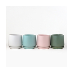 Ideal for houseplants, indoor stoneware ceramic pots with drainage holes and saucers. Includes pallet displayer.  Each pallet contains 18 of each pottery design color: white, aqua blue, soft pink, and forest green. Pottery size : 6" x 5.5"