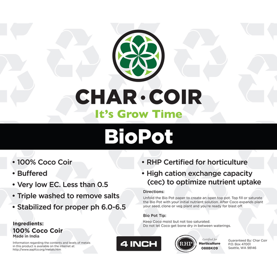 The Char Coir 4" BioPot is designed for the vegetative stage and is equivalent to a 16 oz. cup of substrate minus the plastic cup. No external container is needed. The BioPot is wrapped in a fabric exterior, with compressed coco coir inside. This is one of these easiest ways to use our high quality substrate for your growing needs.