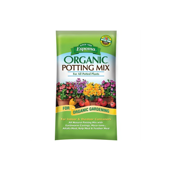 Espoma Organic Potting Mix2cu ftEnhanced with earthworm castings and Myco-tone for stronger roots. for all indoor and outdoor containers and potted plants. Contains a rich blend of only the finest natural ingredients. No synthetic plant foods or chemicals are used. All natural and organic, premium quality blends.